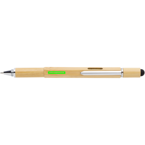 Multifunktions-Bambusstift mit Lineal (7 cm), Wasserwaage, Schraubendreher, Stylus-Spitze und Kugelschreiber mit 400m blauschreibender Tinte. Aus Bambusmaterial mit Aluminiumclip.