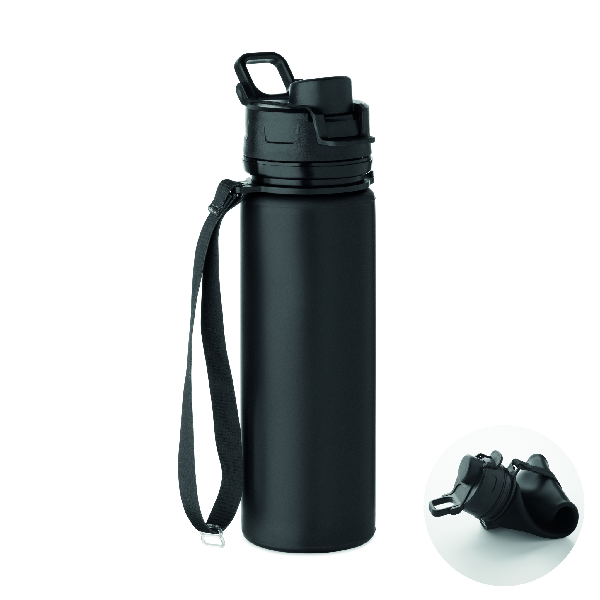 Faltbare Sportflasche aus Silikon. PP-Deckel mit Griff und Schlaufe aus Polyester. Transparenter Riegel zur Sicherung im gefalteten Zustand. Auslaufsicher. Füllmenge: 500 ml.