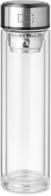 Doppelwandige Flasche aus Borosilikat-Glas. Mit Tee-Sieb. Im Deckel befindet sich eine integrierte Touchscreen LED Temperaturanzeige, die die Temperatur des Getränks anzeigt. Inkl. 1 austauschbare CR2032 - Batterie. Füllmenge: 390 ml. Auslaufsicher.