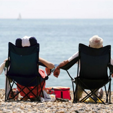 Klappbarer Sessel mit stabilem Stahlrahmen, hochwertigem, robustem Polyesterbezug, integriertem Getränkehalter, Tragetasche und einer Belastbarkeit bis 100 KG. Ihr Logo drucken wir auf die Tragetasche.