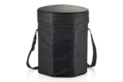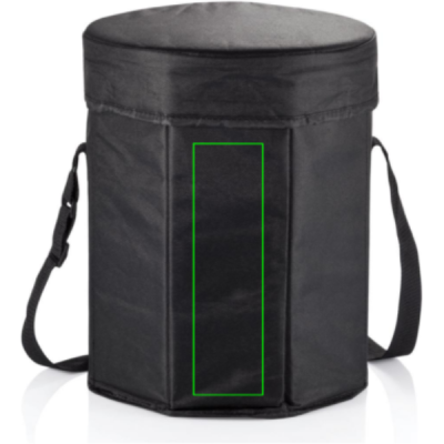 600D Polyester mit schwarzem Kunststoffüberzug, Durchmesser 30cm x Höhe 35cm, klappbar, als Kühlbox und Sitz zu gebrauchen.