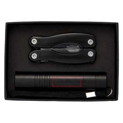 11 Funktionen. Mini Multifunktionswerkzeug mit LED Taschenlampe in schwarzer Geschenkverpackung mit EVA Schaumstoff Einleger. Inkl. Batterien.
