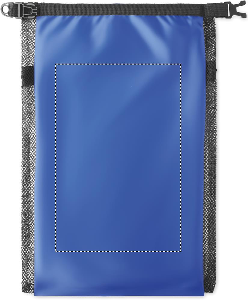 Wasserfester Beutel aus 210D RPET mit Reißverschluss und RPET-Netztasche. Füllmenge: 6 l.