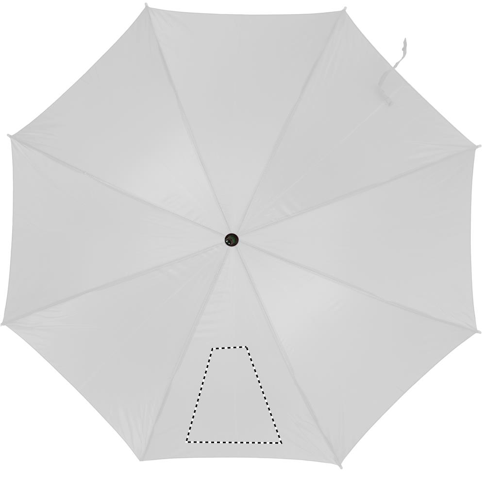 23 inch auto open umbrella in 190T polyester with wooden shaft, tips and top. Black plated metal ribs. Curved natural finish wooden handle.