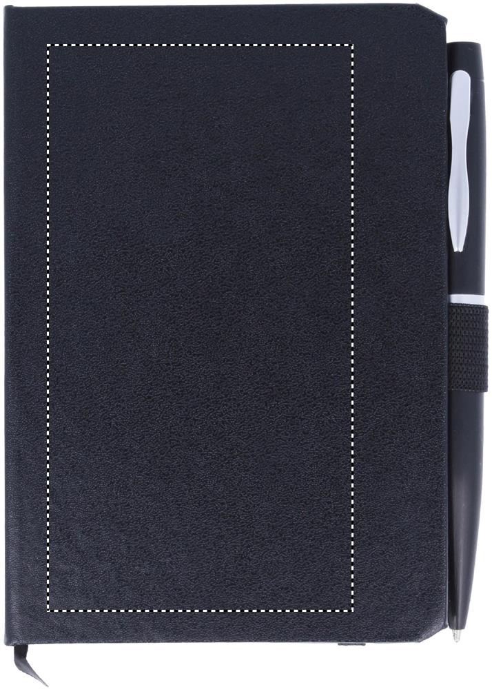 A6 notebook with pen. Hard PU cover. Casebound. 144 lined pages (72 sheets). Matching elastic closure strap, ribbon bookmark and pen holder. Matching metal push button ball pen. Blue ink.