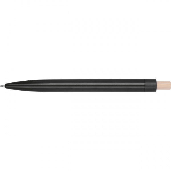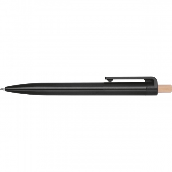 Ballpoint pen made from recycled ABS with a bamboo push button. It features a blue-writing plastic refill. Your logo is printed on the barrel below the clip.
