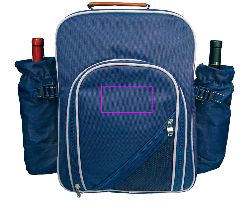 Relax in nature! Enjoy a cozy picnic for 4 with this high-quality polyester picnic backpack. It contains a spacious cooling compartment at the back for keeping your food fresh, two bottle cooling compartments at the sides, plenty of equipment in the front compartment like plastic dishes and glasses, cutlery, a small plastic tray, a corkscrew, a salt and pepper shaker and a knife. The front compartment provides further storage space. We will put your logo on the front compartment.