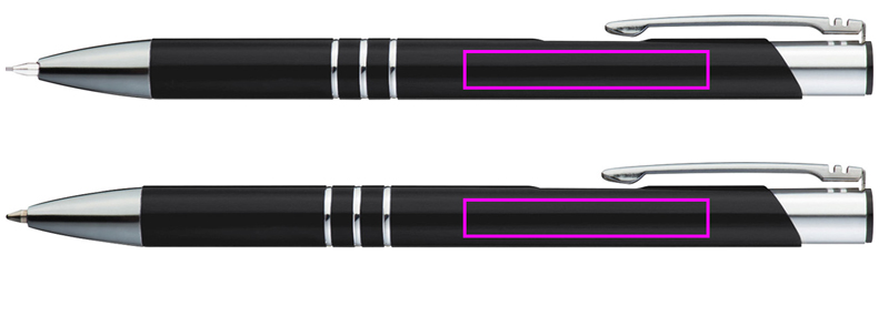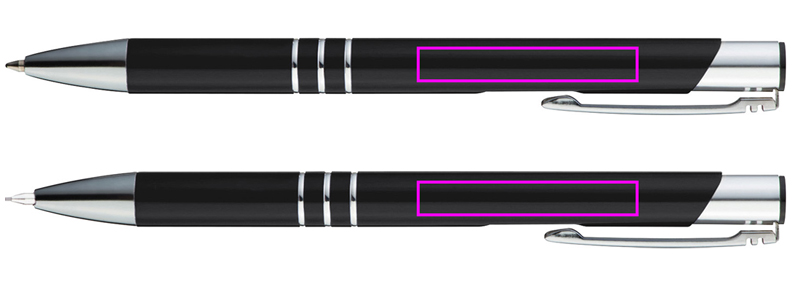 Writing set made of aluminum, consisting of a ballpoint pen with blue writing large capacity refill and a mechanical pencil, each with decorative rings. Your logo will be engraved to the right of the clip.