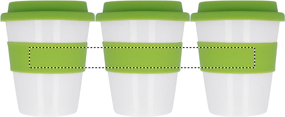 Single wall tumbler in shiny white PP with silicone lid and middle ring. Capacity 350 ml. As this is a single walled mug heat transfer can still occur.