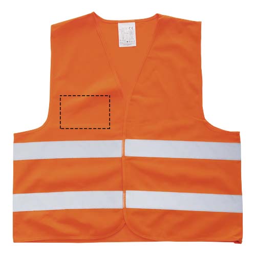 High visibility warning vest Class 2, suitable for persons between 165-180 cm. Large decoration area on the front and on the back of the vest. Visibility clothing for professional use. Fluorescent background and reflective tape. Specification EN ISO 20471:2013+A1:2016. These garments bear CE marking to demonstrate compliance with EU Regulation 2016/425/EU Personal Protective Equipment Category II.