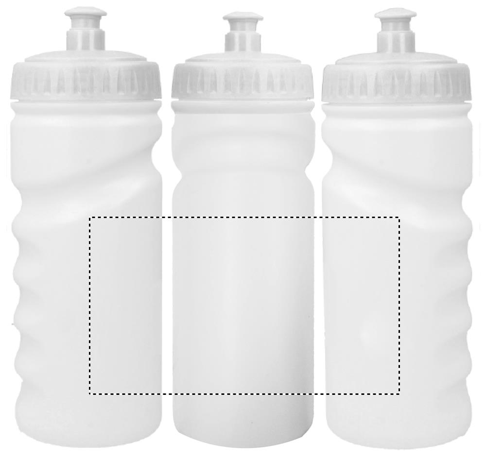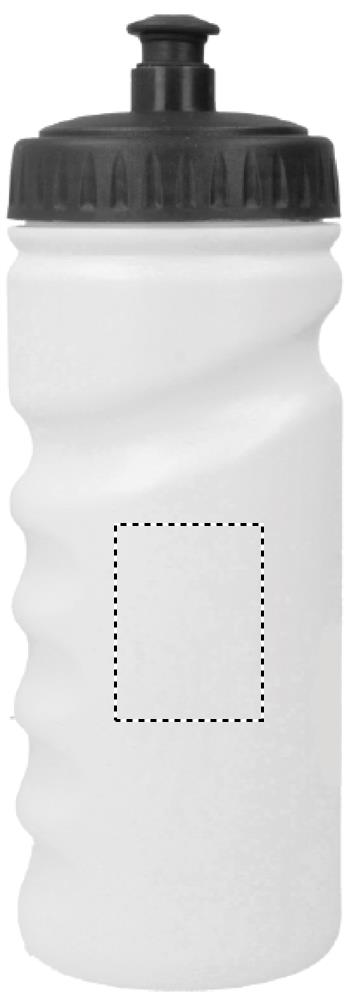 Sports drinking bottle with convenient handgrip in solid PE plastic which is BPA free. Capacity: 500 ml. Leak free.