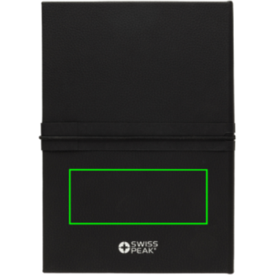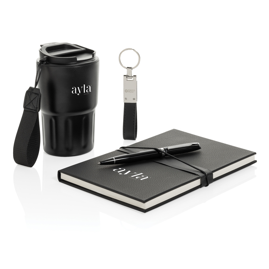 This luxury gift set includes all the essentials you need to get through your workday in style. The 350 ml double-walled tumbler is vacuum insulated, keeping your drink hot or cold for an extended period. The leak-proof lid ensures your clothes stay dry, even if the tumbler is accidentally tilted or not held upright.To keep your most important keys always within reach, the set includes a premium Swiss Peak keychain featuring a glossy metallic finish and a beautifully crafted PU leather strap.Need to jot down some thoughts or ideas? This set also comes with a sleek business ballpoint pen with a writing capacity of 1000 meters, and a soft-touch PU notebook made from recycled polyester. The notebook contains 160 cream-colored pages made from recycled paper.All items in this gift set are RCS certified, guaranteeing a fully verified supply chain for the recycled materials used. In total, the products in this set consist of 75% recycled content.