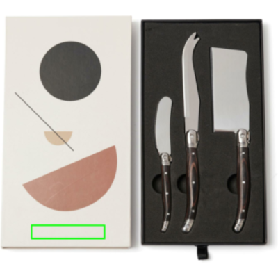 An exclusive stainless steel cheese knife set consisting of two cheese knives and a butter knife with a black pakka wood handle. Packed in an exclusive gift box.