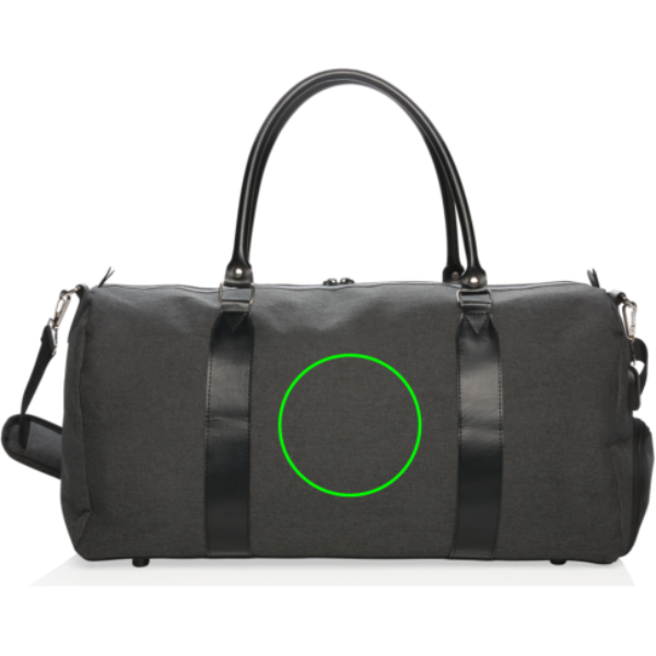 Modern and minimalist 600D polyester weekend bag with PU handles & comfortable shoulder strap. Large main compartment with plenty of room for your weekend necessities or sports gear. Connect your powerbank easily to the integrated USB A charging port and charge your phone or tablet whilst on the go. Also comes with quick access pocket on the right. PVC free.