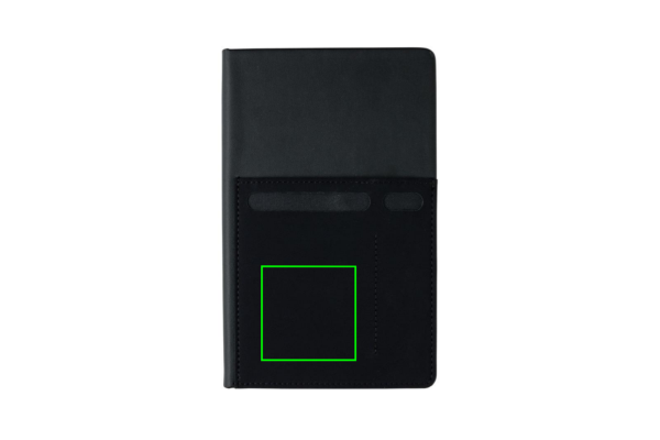 A5 märkmik, mille sees on 160 kreemikat joonitud lehte 80g/m2 paberist. Esikaanel on elastne telefonitasku, pliiatsitasku ja suurem varruktasku dokumentide jaoks. Telefonitasku on 8 cm lai, mis sobib iPhone 7 plussiga.
