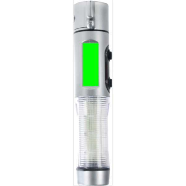 Avariivalgusti, hõbedane ABS-korpus, 1 valge LED ja 9 punast välklampi küljel, lõikur, aknapurustaja ja magnetalus auto katusele paigutamiseks.