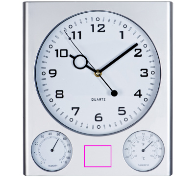 Elegantne valge sihverplaadi ja mati hõbedase pinnaga seinakell; kuvab kellaaega, niiskust ja temperatuuri. Trükime teie logo hügro ja termomeetri vahele.