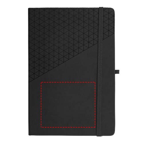 Pehme puudutusega geomeetrilise mustriga A5-suuruses märkmik. Sealhulgas 80 lehte (80 g/m²) vooderdatud paber, paelmarker, elastne sulgur ja pliiatsi aas.