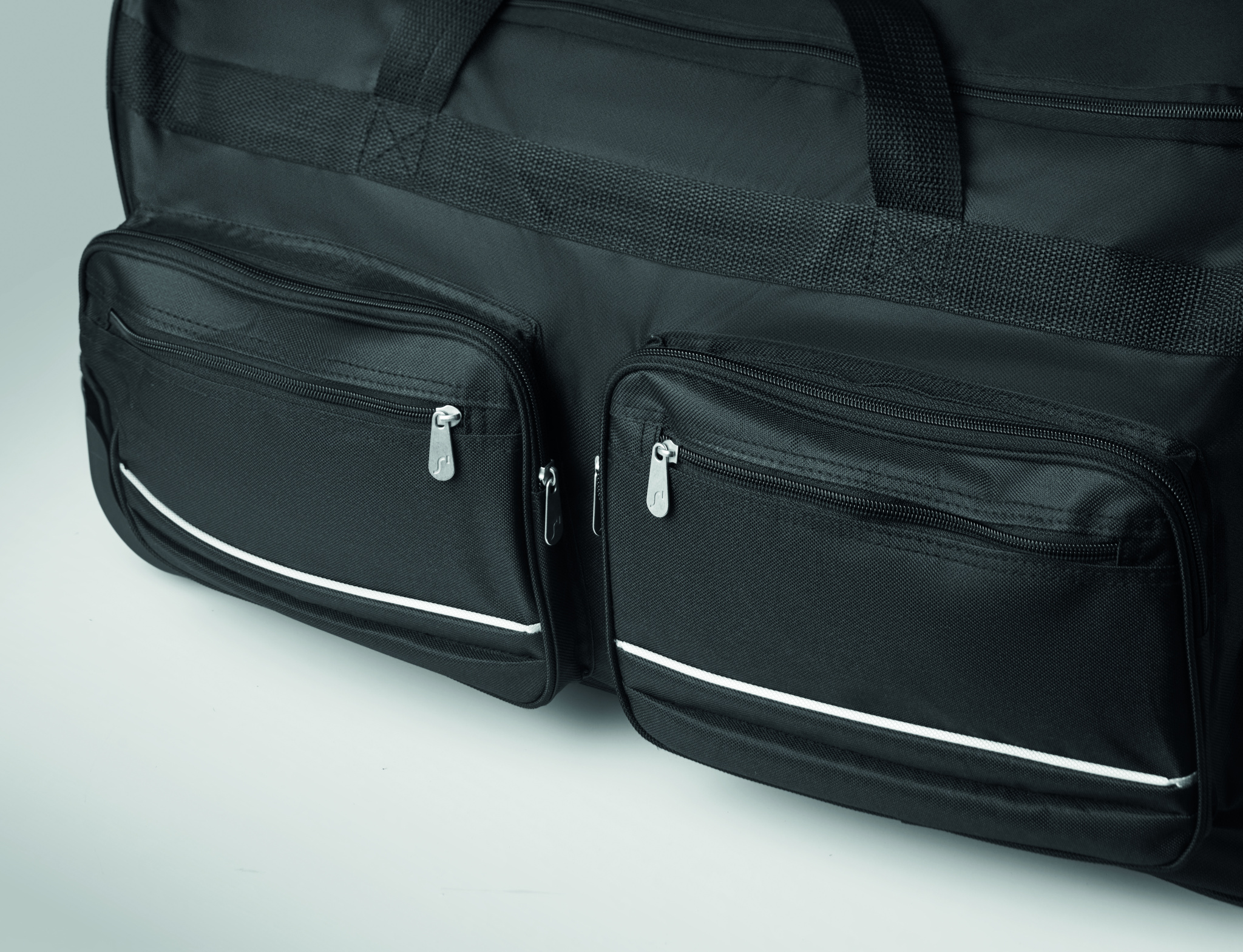 Pehmeä duffeli vetolaukku 600D RPET -materiaalia. Vetoketjullinen etutasku. Kaksi sivutaskua. Kolme sisätaskua. Pehmustetut olkahihnat. Kaksi pyörää ja tuplaputkirunko.