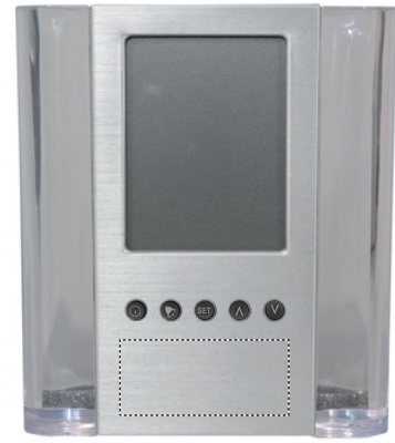 Kynäteline kalenterilla, herätyskellolla ja lämpömittarilla.