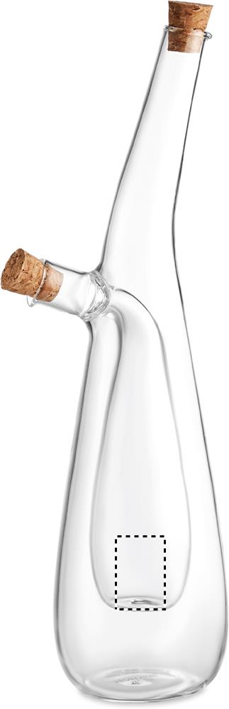 Borosilikaattilasista valmistettu öljy-/ etikkapullo, korkista valmistetulla korkeilla. Ulkoisen pullon tilavuus 300ml ja sisäisen- tilavuus 80 ml. Borosilikaattilasiin ei voi kaiverruttaa.