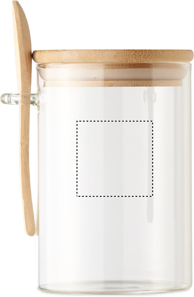 600 ml borosilikaattilasi purkki bambu kannella ja bambu lusikalla. Luonnollisen materiaalin (bambu) vuoksi, tuotteiden värissä/ koossa saattaa olla erinäisyyksiä ja tämä voi vaikuttaa painatuksen lopputulokseen.