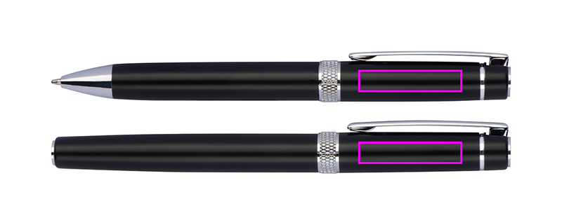 Kirjoitussetti, joka koostuu kierrettävästä kuulakärkikynästä, jossa on sininen kirjoitusjärjestelmän täyttö, ja sinisestä alumiinista valmistetusta kirjoitusrullapallosta kotelossa. Kromisovellukset ja kimaltelevat koristerenkaat antavat setille sen tyylikkään ilmeen. Logosi kaiverretaan molempiin kynään klipsien oikealle puolelle.