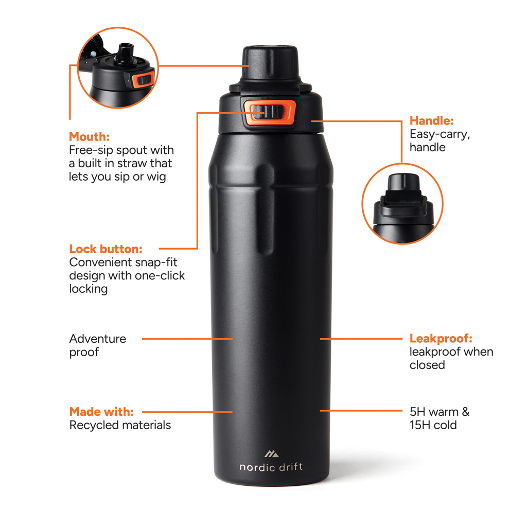 Kestävä ja valmis seikkailuun. Nordic Drift -kierrätysteräspullo on valmistettu 79 % RCS-sertifioidusta kierrätetystä ruostumattomasta teräksestä. 750 ml tilavuus, jauhemaalattu pinta, kantokahva ja lukittava kansi tekevät siitä täydellisen kumppanin liikkeellä oloon. Innovatiivinen korkki tarjoaa kaksi juomatapaa – nokasta tai siemaillen – helppoon nesteytykseen matkalla. Tiivis ja kestävä pullo sopii niin ulkoiluun kuin arkeen, yhdistäen käytännöllisyyden ja vastuullisuuden.Toimitetaan FSC®-sertifioidussa lahjapakkauksessa.Kaikilla Nordic Drift -tuotteilla on 5 vuoden takuu valmistusvirheitä vastaan.