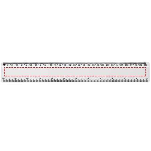 Tukeva kierrätysmuovinen viivain, johon on merkitty tuumat ja senttimetrit.
