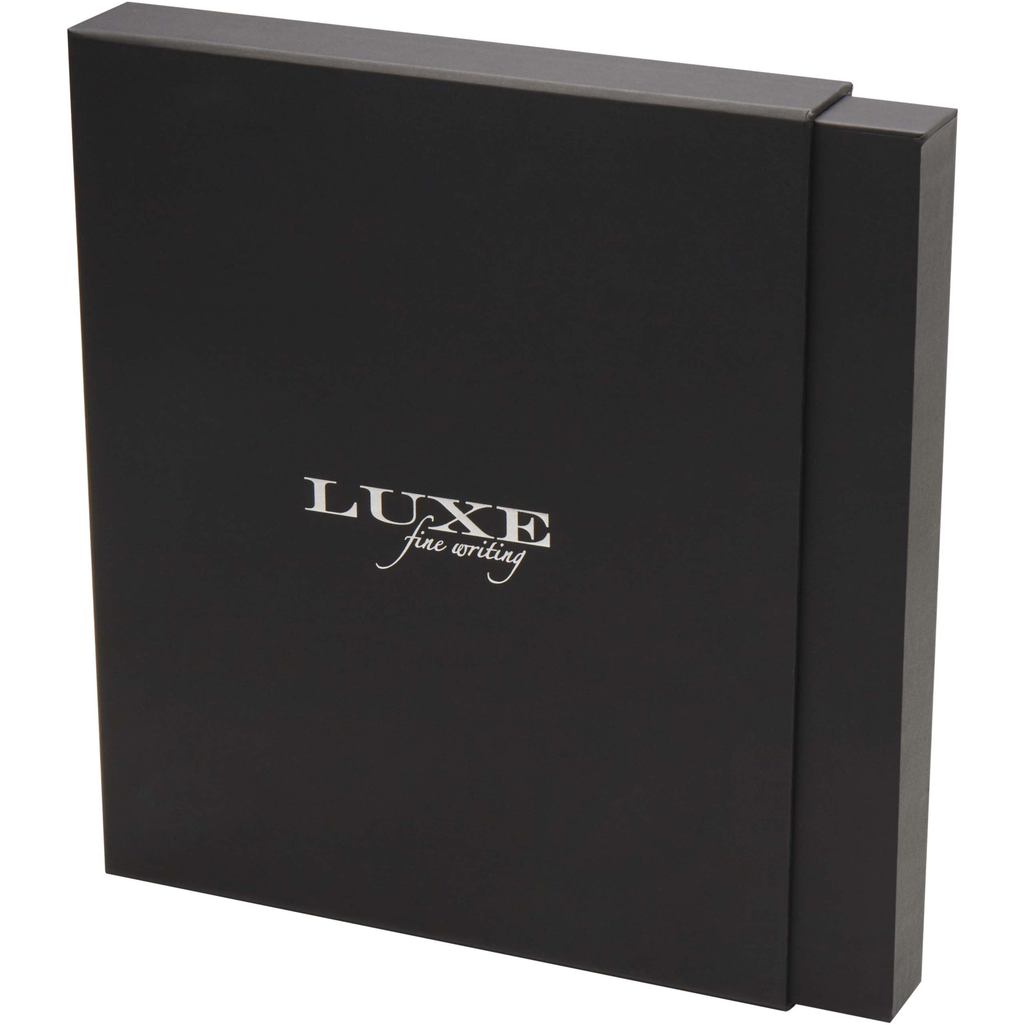 „Legato“ rinkinys – tai elegantiškas A5 formato užrašinės ir rutulinio rašiklio derinys. Rašiklis turi RCS sertifikuotą perdirbto žalvario viršutinį korpusą su sidabro chromo apdaila, apatinį korpusą su spalvota purškiama danga, metalinius sidabro chromo priedus ir LUXE logotipą ant vidurinio žiedo. Rašalo spalva: mėlyna. Rašymo ilgis: 400 metrų. Plunksnos dydis: 0,7 mm. Pridedamas papildomas juodos spalvos užpildas. Užrašų knygelėje yra 80 lapų 80 g/m² kreminės spalvos linijinio popieriaus, perdirbto odos imitacijos plastiko viršelis, elastinis užsegimas, juostelinis žymeklis ir akordeono kišenėlė. Sidabro chromo spalvos metalinis priedas ant elastingo užsegimo. Pristatoma kartoninėje dovanų dėžutėje.