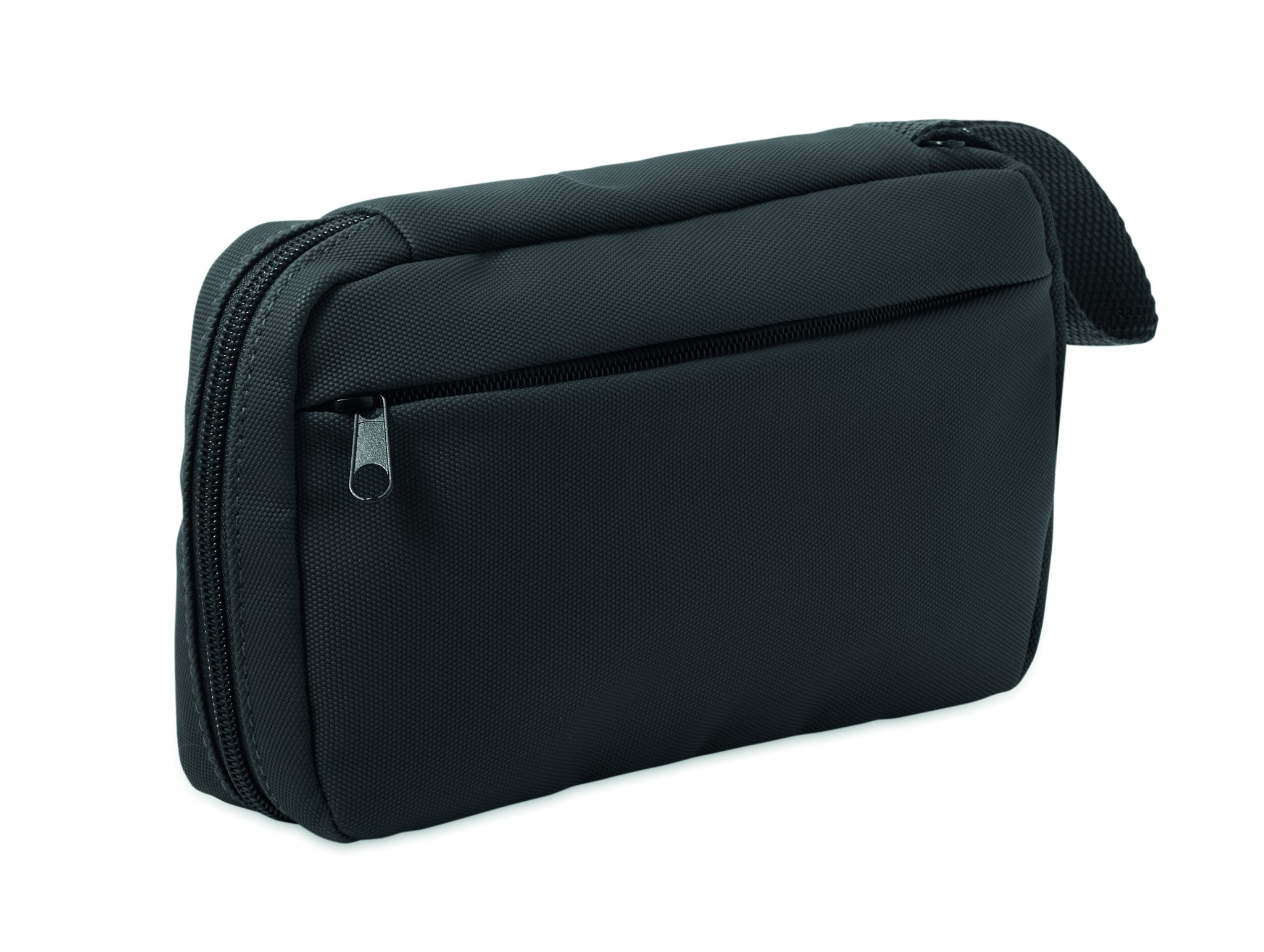 Tualetes piederumu somiņa no 600D RPET auduma ar PU pārklājumu, RPET sietu un 210D RPET oderi. Aprīkota ar priekšējā nodalījuma kabatu ar rāvējslēdzēju, iekšējo sietu un atvērtām kabatām.