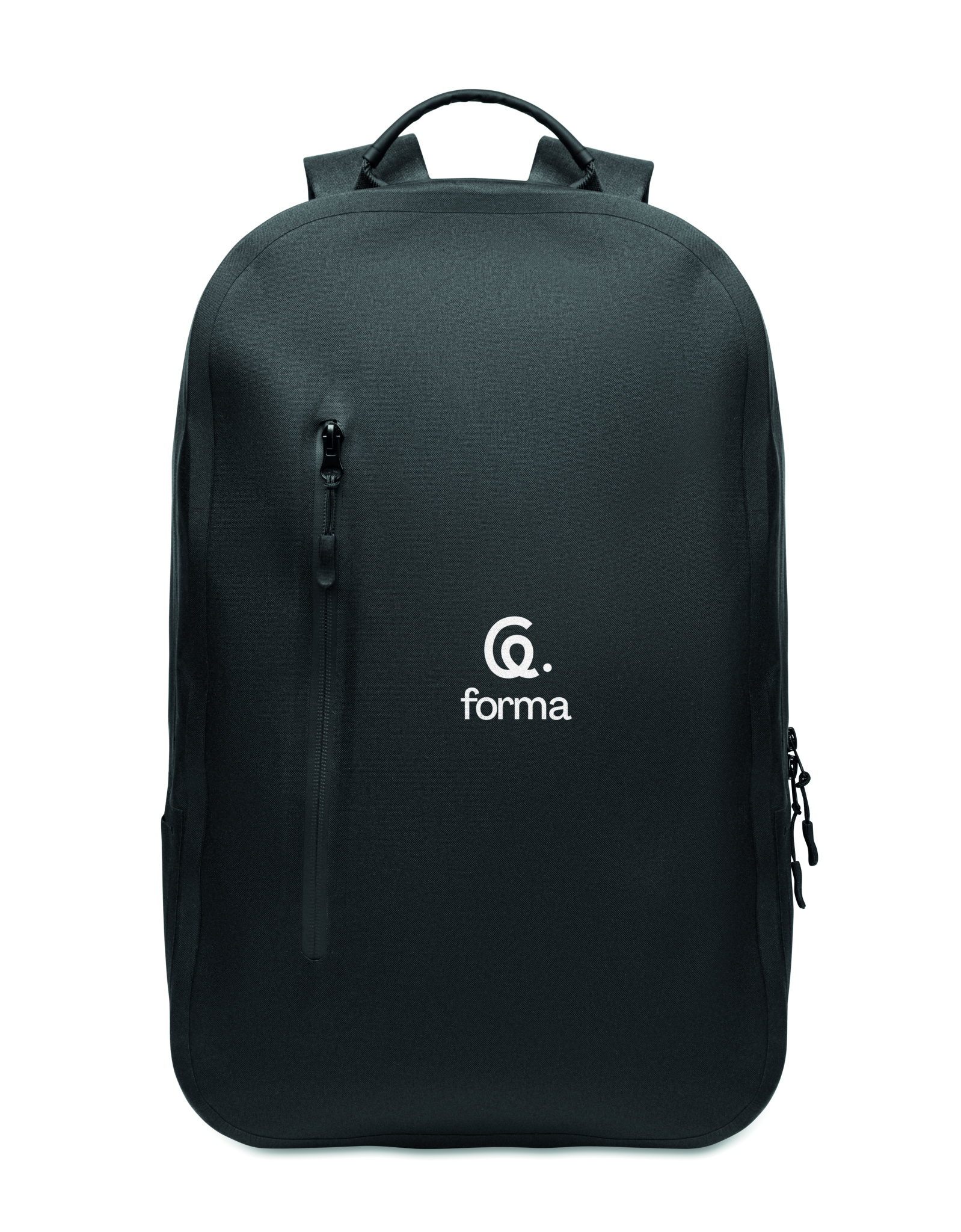 Laptop backpack 16'' in 300D RPET polyester and 210D polyester lining. Water-resistant fabric. Hidden zippered pocket and trolley holder on the back. Padded internal laptop compartment, mesh back and shoulder strap.