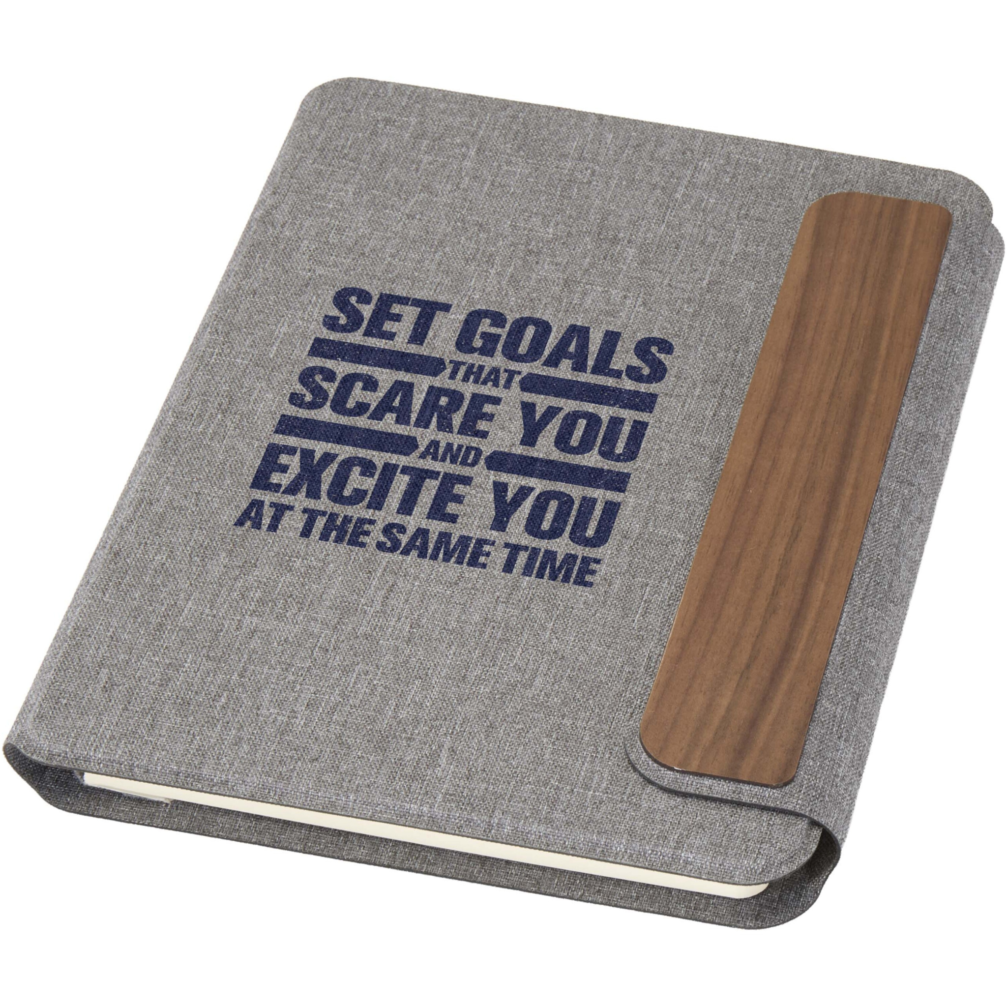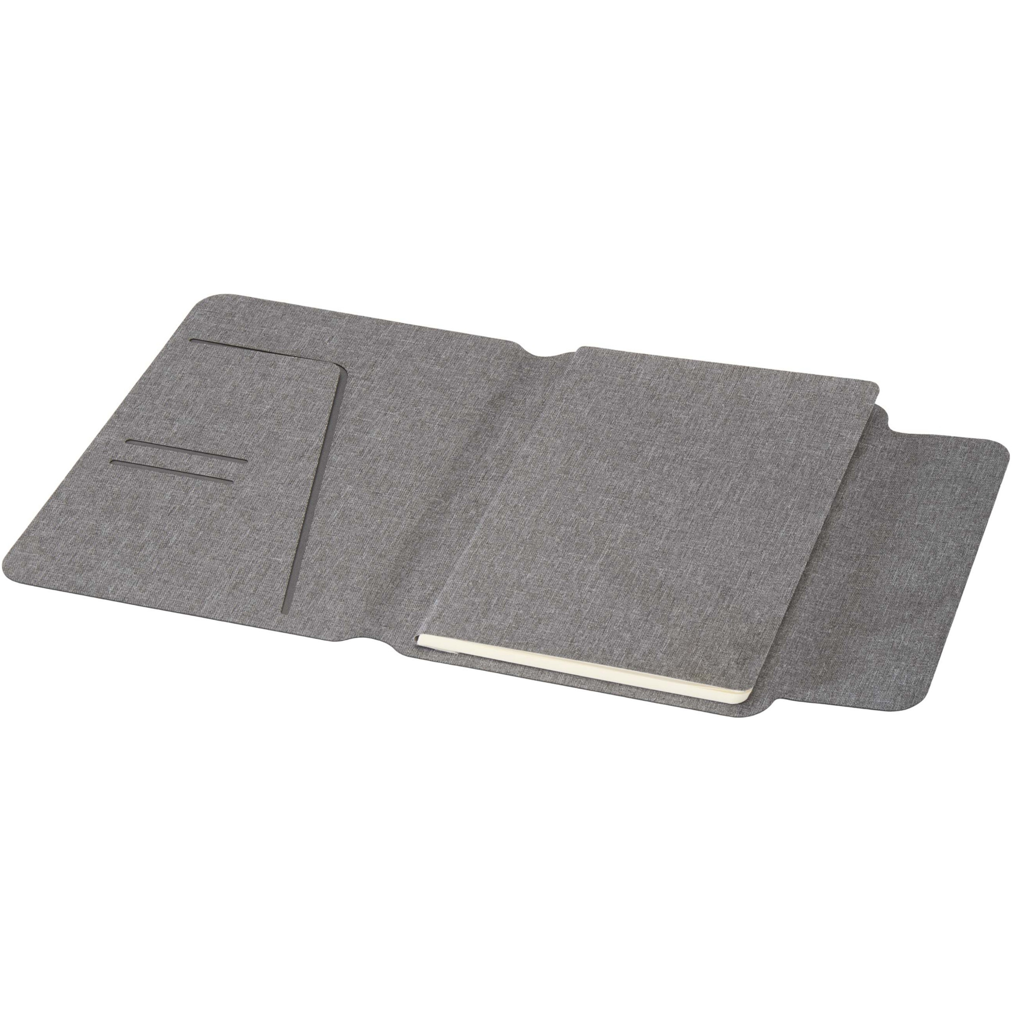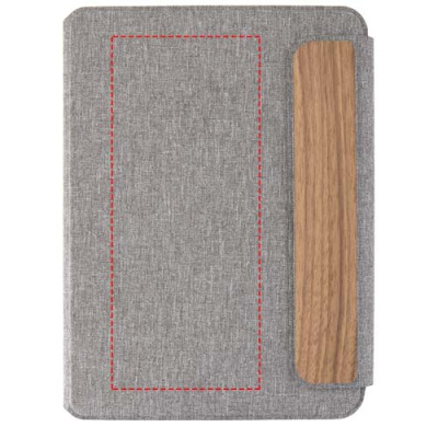 Портфель A5 Andean частично изготовлен из переработанного полиэстера, сертифицированного RCS, что является более экологичной альтернативой за счет снижения зависимости от первичных материалов. Изделие, сделанное с использованием технологии прецизионной сварки, имеет гладкий серый твердый внешний слой с закругленными углами, а также магнитную застежку, дополненную изысканной деталью из орехового дерева, что придает современный и изысканный вид. Внутри вы найдете блокнот в мягкой съемной обложке с 64 линованными листами кремового цвета, изготовленный из бумаги плотностью 80 г/м², полученной из ответственных источников. Поставляется в обложке из крафтовой бумаги.