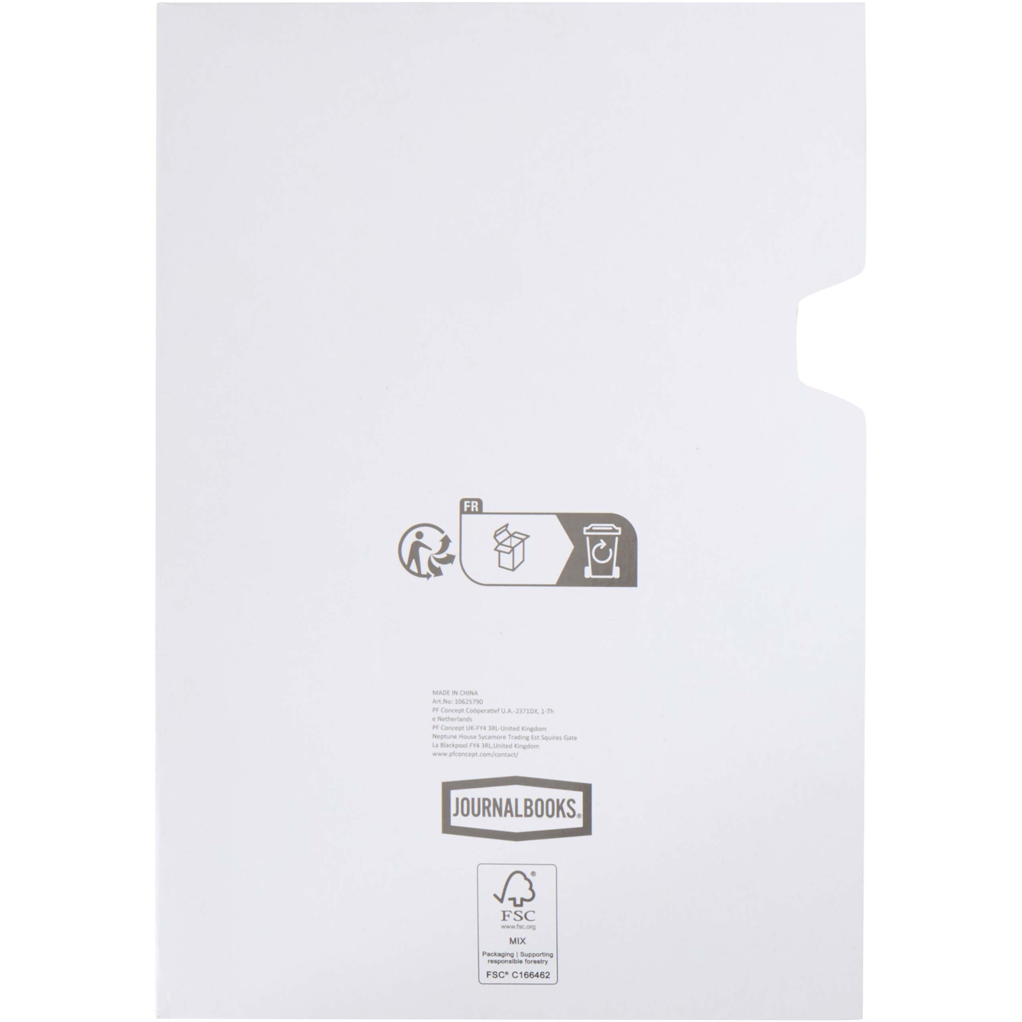 Блокнот Alder формата A5 изготовлен из переработанного пластика, имитирующего кожу, и имеет 192 листа из кремовой бумаги плотностью 80 г/м², оформленные в виде планировщика, идеально подходящего для ведения дневника и поддержания порядка в течение всего года. Имеет две эластичные резинки, три ленточные закладки (черная, красная и синяя), 200 разноцветных липких заметок (по 40 каждого цвета) и удобный бумажный кармашек для отдельных заметок. На задней обложке тиснением нанесен логотип JournalBooks, упаковано в белый бумажный конверт.