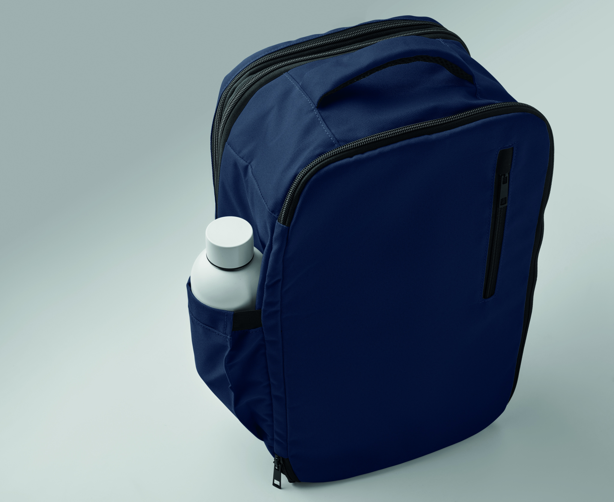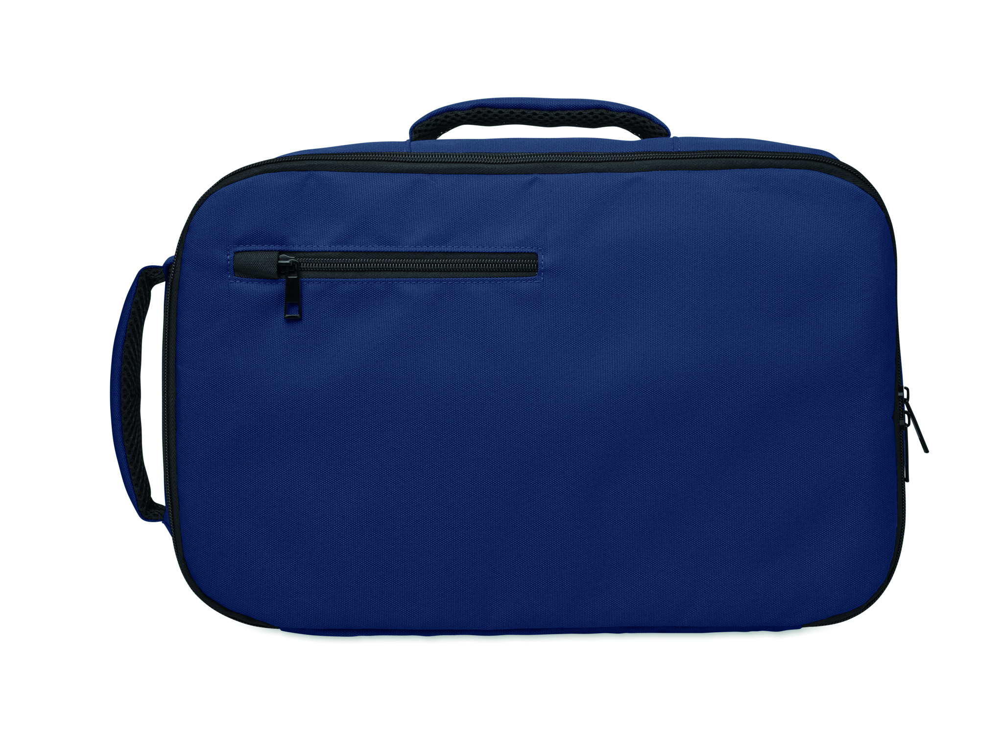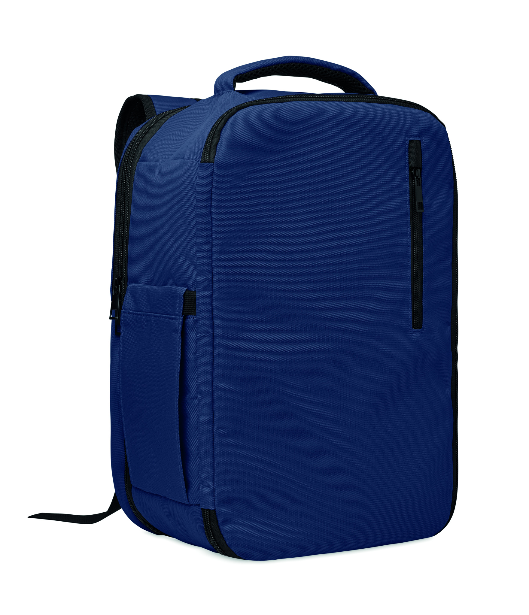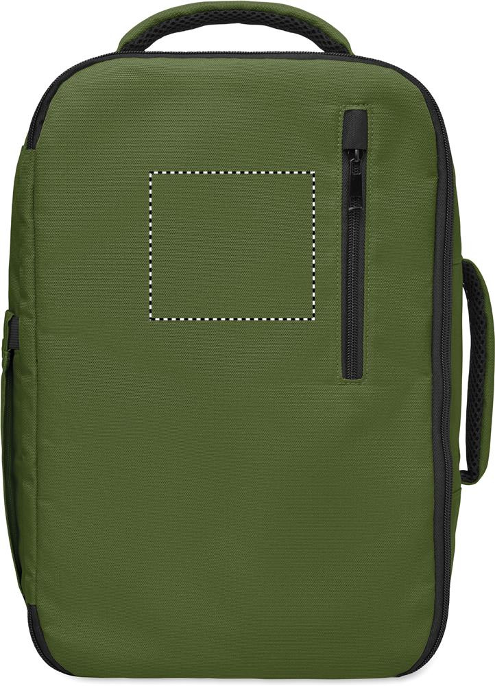 Cabin-size carry-on extendable backpack made of 600D RPET polyester with 180o opening. Features a main compartment with two open sections, mesh division, padded 15'' laptop pocket, and luggage strap.