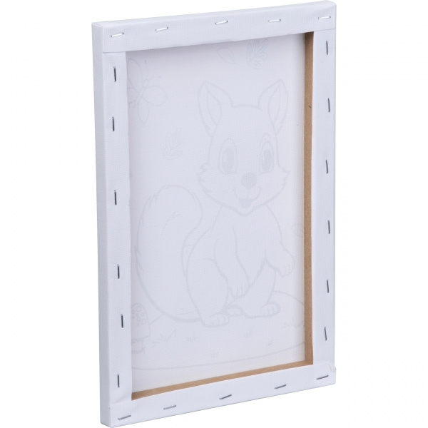 Холст в деревянной раме с изображением белки для раскрашивания. В комплект входят пять красок разных цветов (чёрный, красный, оранжевый, жёлтый и зелёный). Ваш логотип наносится на индивидуальную упаковку с помощью наклейки CMYK.