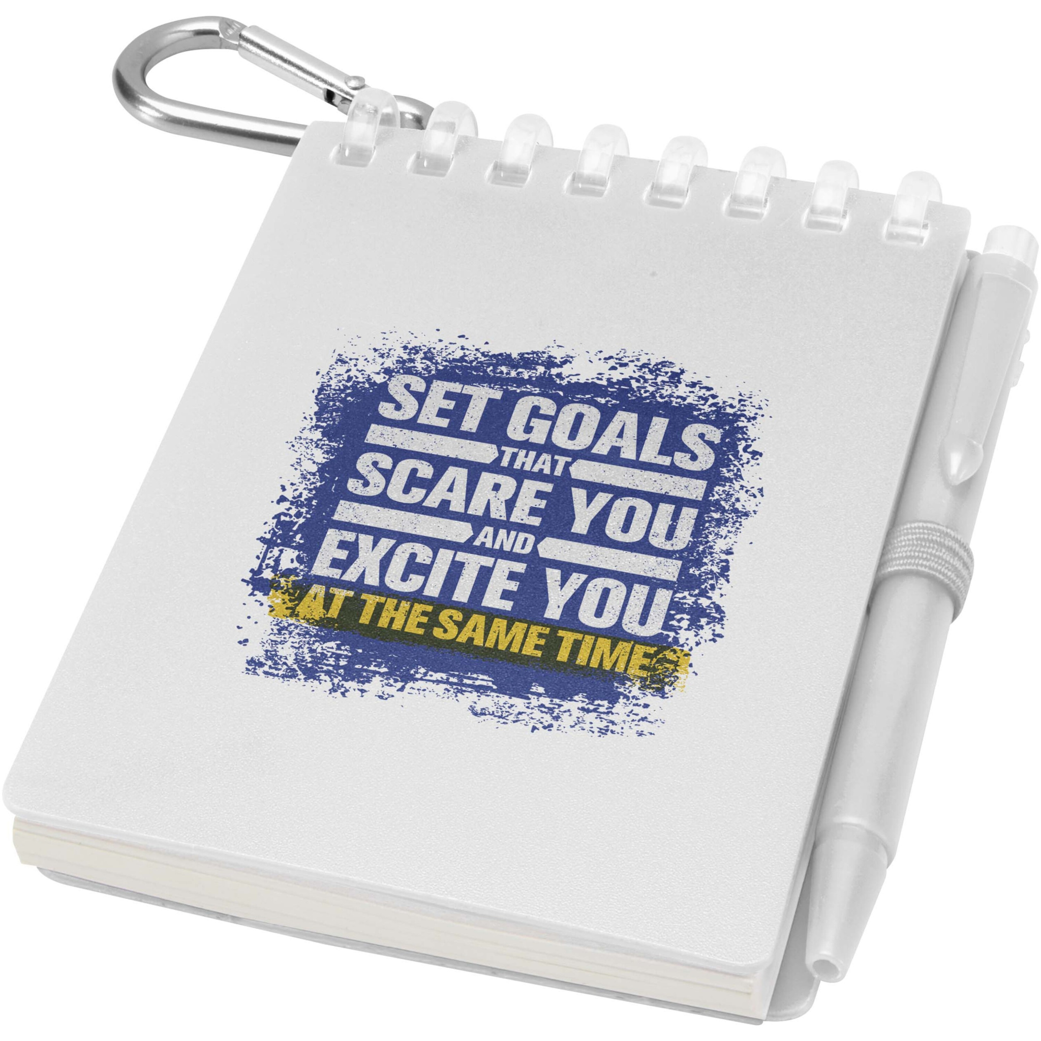 Набор из мини-блокнота и ручки Lig — компактный и практичный помощник для заметок в дороге. Блокнот на спирали имеет мягкую обложку из переработанной пластмассы и 70 чистых листов водостойкой каменной бумаги плотностью 120 г/м², что делает его идеальным для использования на открытом воздухе. Благодаря закругленным углам и встроенному держателю для ручки он соответствует тренду на мини-размеры, оставаясь при этом функциональным. Соответствующая шариковая ручка изготовлена из переработанного пластика ABS, пишет черными чернилами и обеспечивает длину письма 250 метров. Благодаря металлическому кольцу, подобранному по цвету, набор можно легко прикрепить к рюкзаку, сумочке или брелку для ключей, что делает его идеальным для долговечных и портативных заметок. Размер блокнота: 11 x 7,5 см.