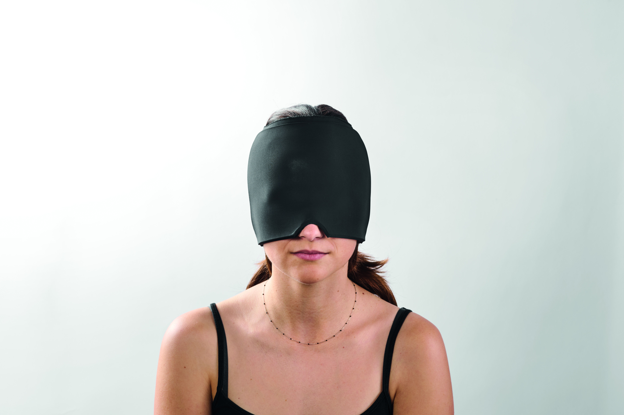 Hot and cold compress relief cap in stretchable and adjustable Lycra (for headache, pain and tension). One size fits all.