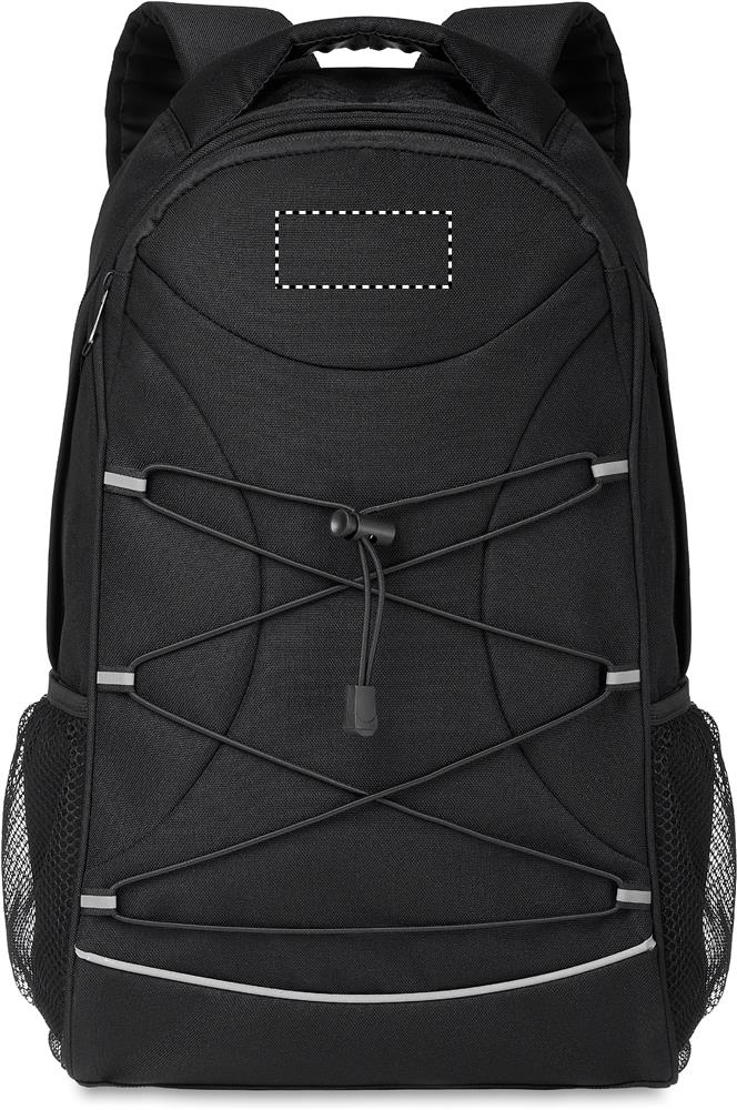 Рюкзак из RPET 600D с темными шнурками спереди и светоотражающей передней панелью. Сетчатые карманы с двух сторон.