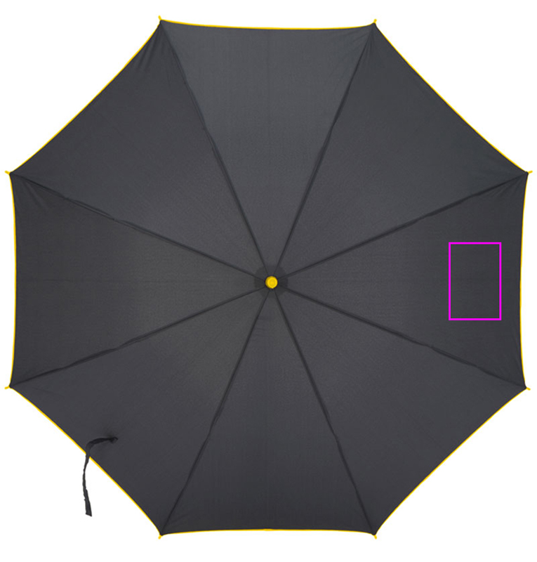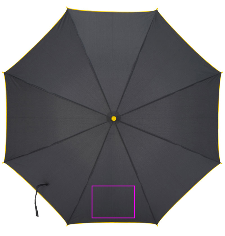 Автоматический зонт из эпонжа 190T со стекловолоконными стойками, пластиковой ручкой, цветным ободом, ручкой и рамой. Мы печатаем ваш логотип на одном сегменте.