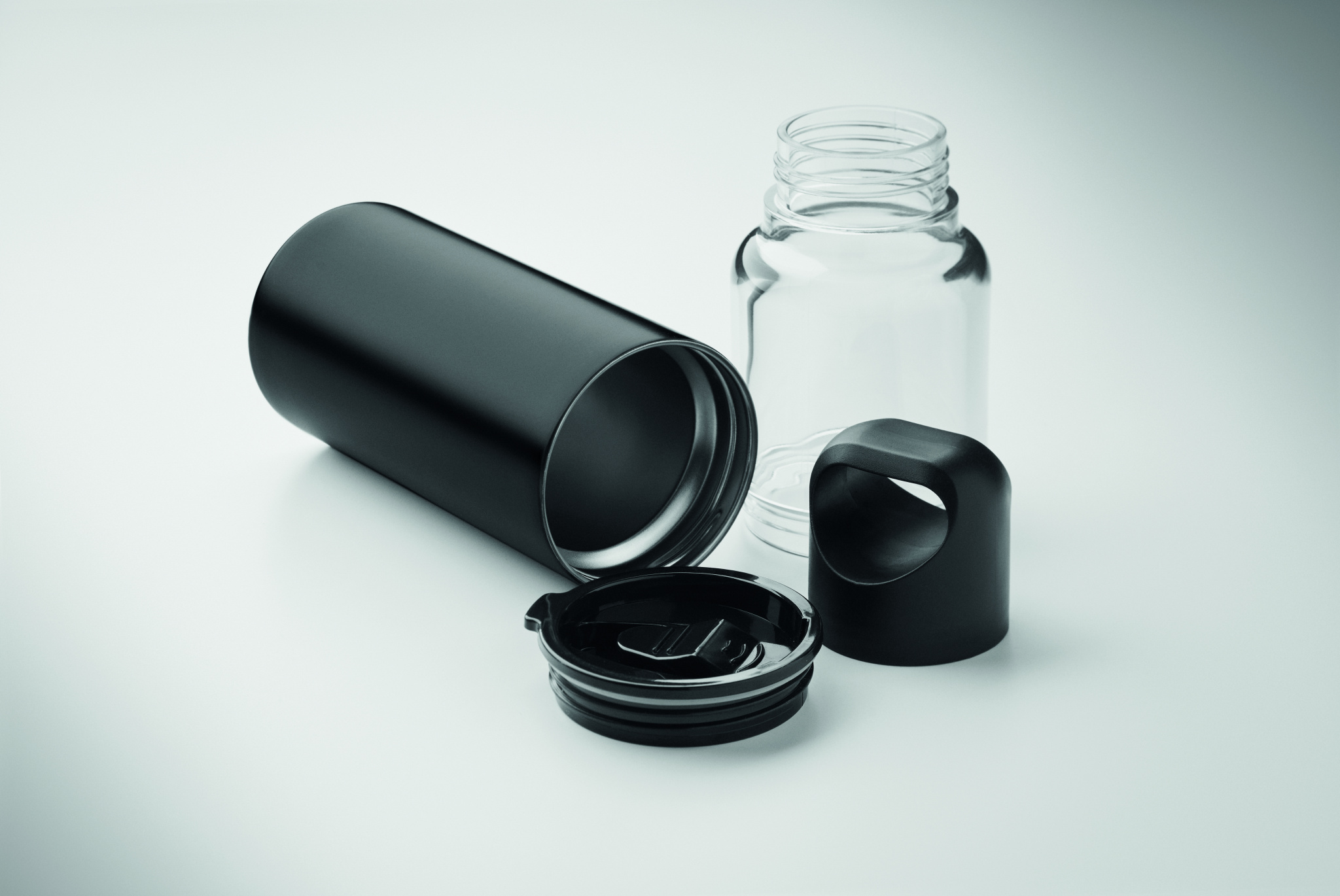 2 i 1-flaska i Tritan och dubbelväggig muggdel i återvunnet rostfritt stål (90 % återvunnet och 10 % rostfritt stål). 2 lock i PP-material. Volym totalt 610 ml, endast dricksglas 350 ml.