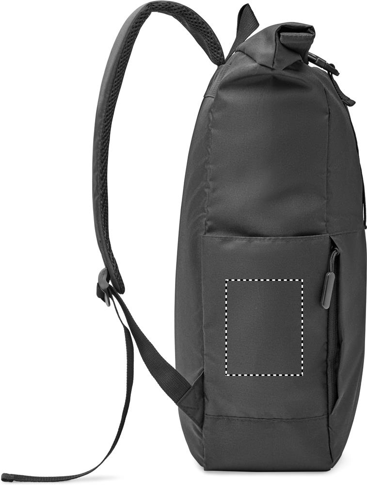 15 tums dataryggsäck med rullstägning i 300D RPET polyester. Stor frontficka med dragkedja, dold sidoficka med liten karbinhake på insidan. Karbinhaken är ej för klättring (profesinell användning)