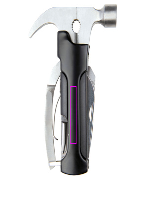 Multifunktionsverktyg (rostfritt stål) bestående av en hammare, en fil, två blad, en såg, en spårskruvmejsel och en flasköppnare. Medföljer ett matchande fodral där vi trycker din logotyp i mitten.