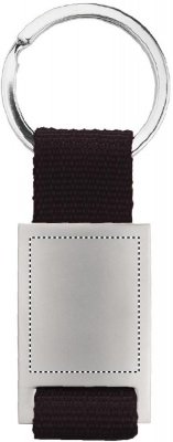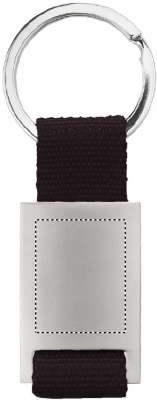 Rektangulär nyckelring i metall och färgat polyesterväv.