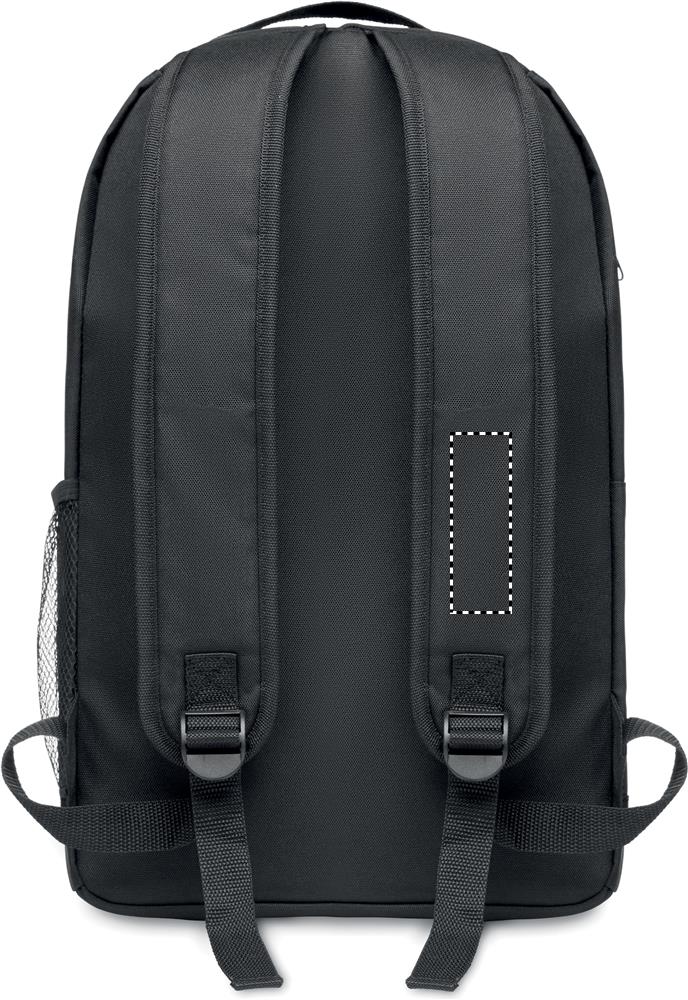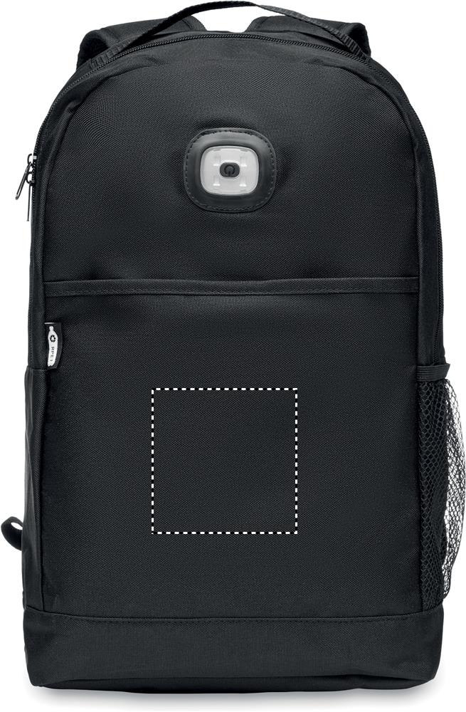 Ryggsäck i 600D RPET, framficka med kardborrstängning, nätficka på sidan och COB-ljus på frontpanelen som kan tas av. Har fast eller blinkande sken. COB-lampa med vitt ljus med tre olika ljusinställningar. Knappcellsbatteri ingår. Mått: 28x34x13cm, Volym ca 12,5L