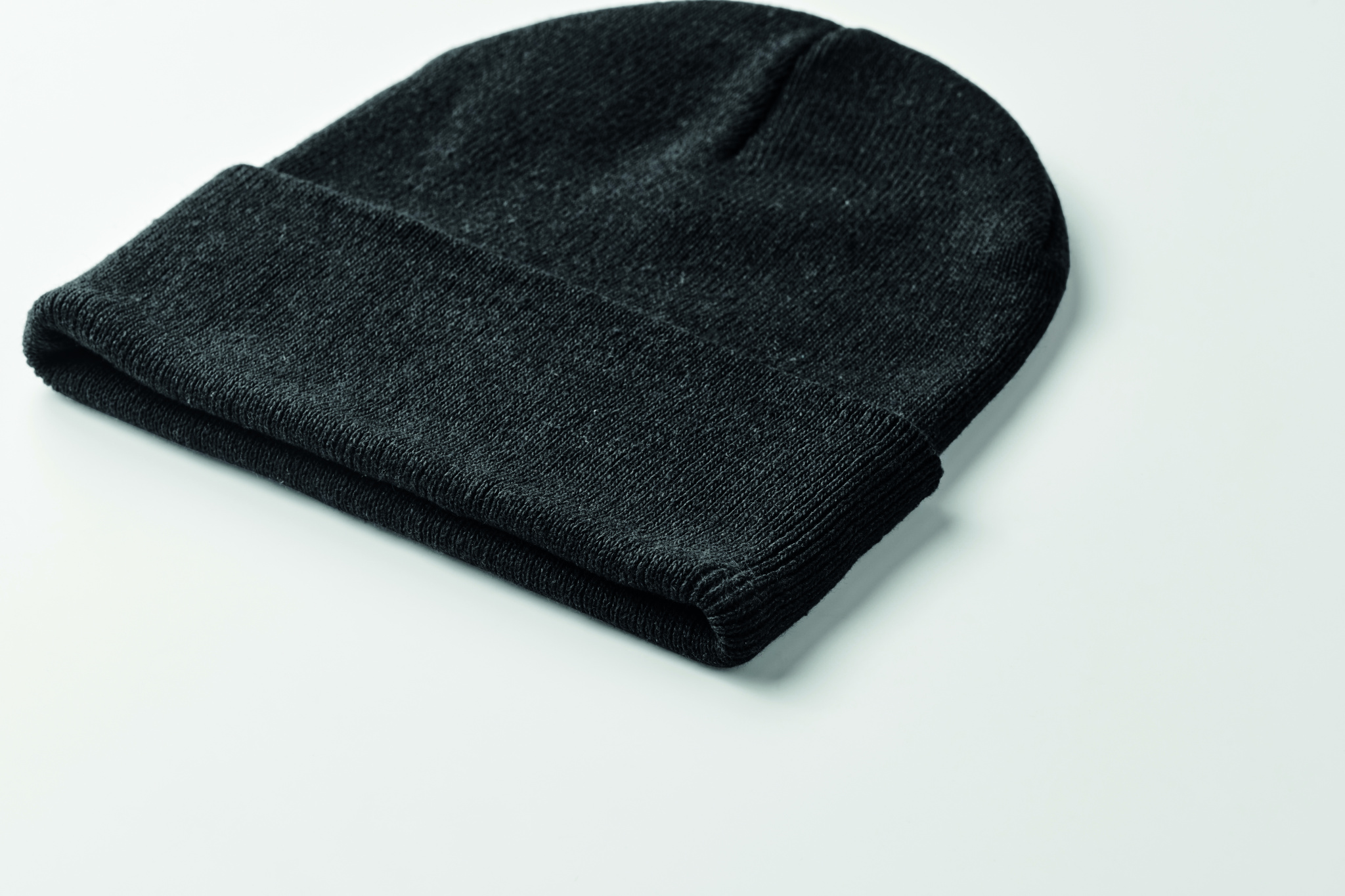 Unisex stickad mössa i mjuk, stretchig polyester (64%) och akryl (36%) med upprullad mudd. En stretchig one-size-fits-all design.