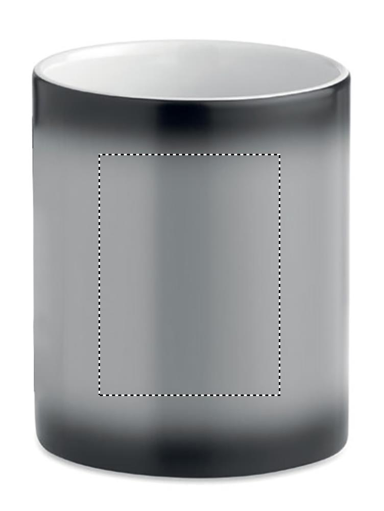Keramikmugg 300 ml, med en speciell beläggning för sublimering. Om man gör tryckmotivet i svart färg visar sig budskapet när man häller (minst) 50°C vätska i muggen. Tål ej maskindisk.